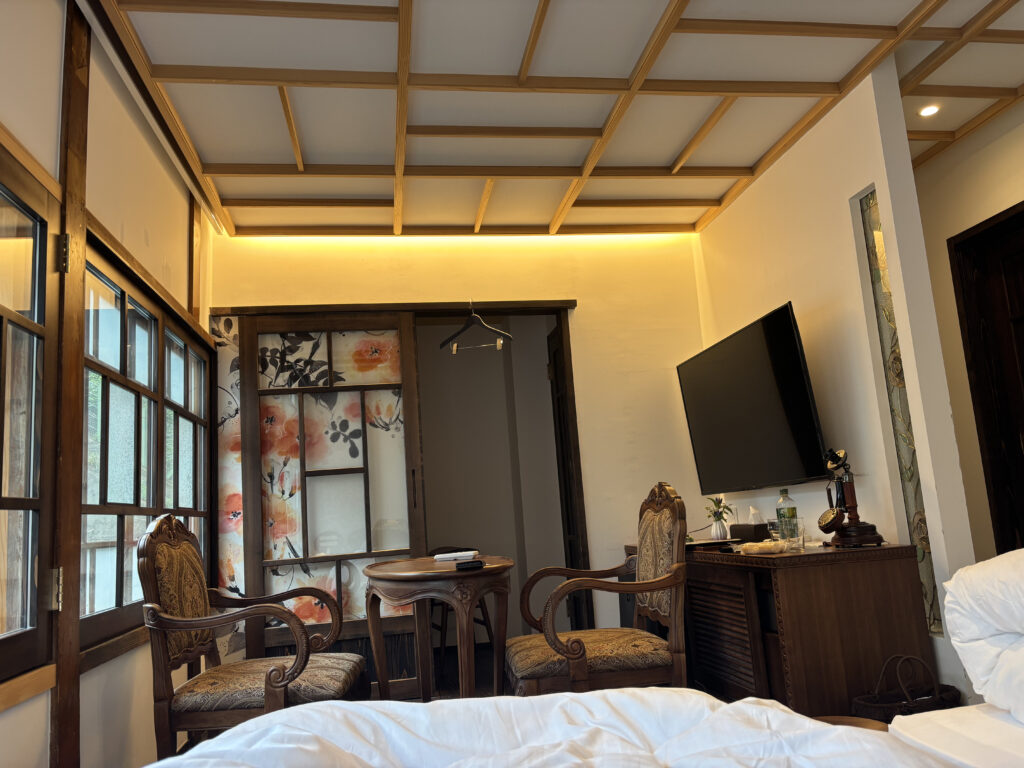 大正時代の木造建築・本物の黒電話・アンティーク調の家具…その一方で、部屋の鍵はQR式・電動昇降のブラインド・最新設備の綺麗なトイレ…大正ロマンと最新技術が心地よく融合した客室でした。