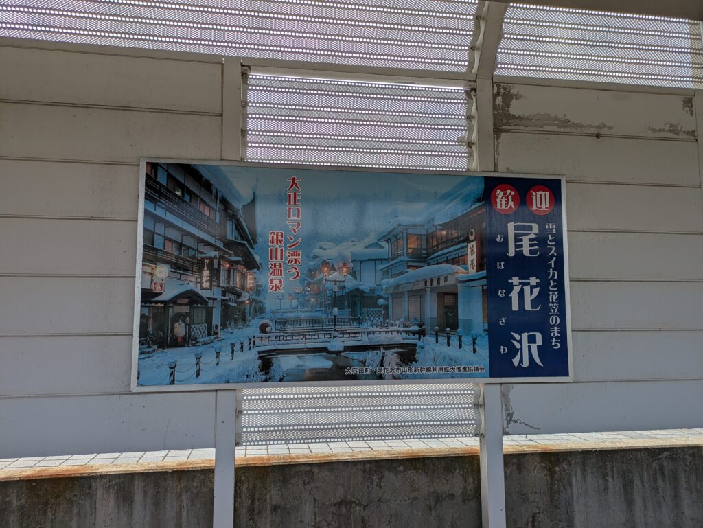 こうして、あっという間の1泊2日の銀山温泉旅行は終了しました。旅館が運営する送迎バスに乗って大石田駅まで送ってもらいます。バスの発着は銀山荘の前なので、ここから少し(5分くらい)歩きます。