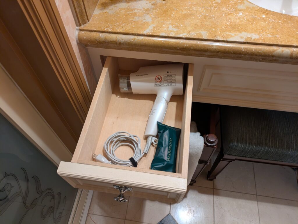 こちらの引き出しにはドライヤーとヘアーブラシ。他のアメニティは複数あるのに、ヘアーブラシだけは一つしかありませんのでご注意ください。まぁ私は使わないので全然OKです。