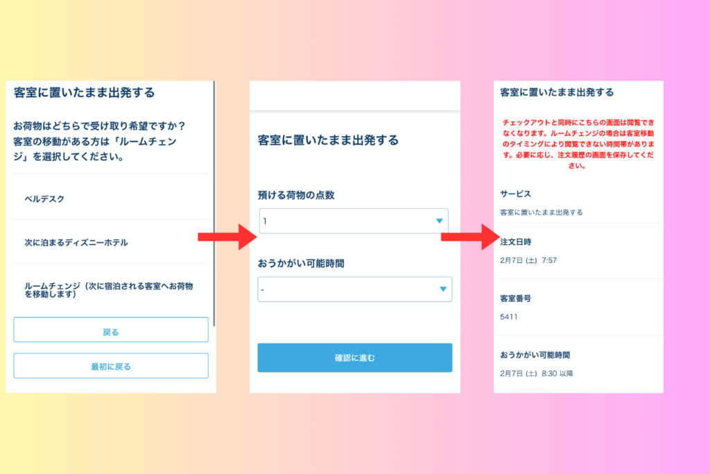 「客室に置いたまま出発する」を選択すれば手ぶらでパークに直行できる!
